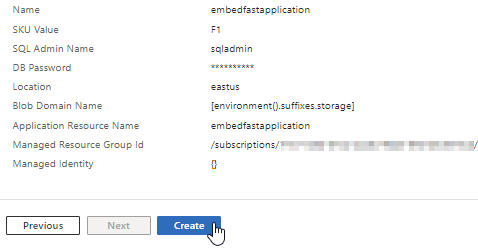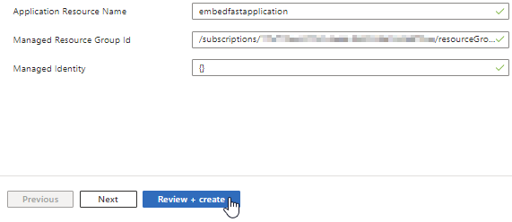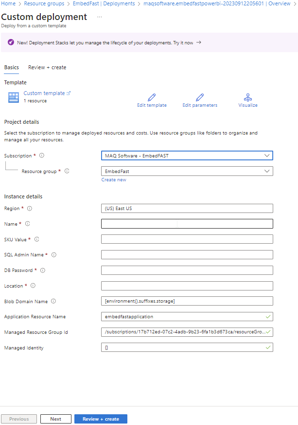 6. Enter the required details **exactly** as they were entered during the [initial deployment](https://maqsoftware.gitbook.io/embed-fast-technical-documentation/setting-up/deployment/deploy-automatically-via-azure-marketplace#create-a-managed-application).&#x20;
