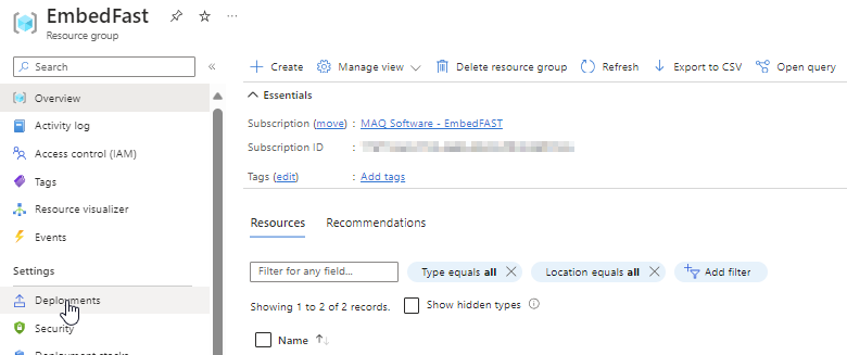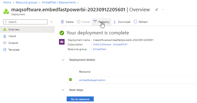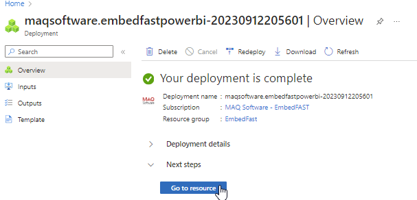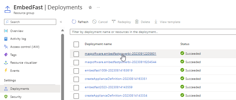 4. Select the latest deployment that is listed as “**maqsoftware.embedfastpowerbi-**” followed by a string of numbers (the date and time).&#x20;