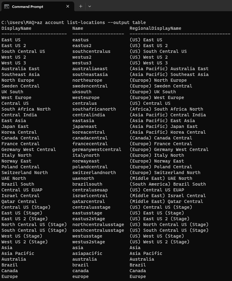7. Run the “**az account list-locations --output table**” command in PowerShell to fetch the location. Enter the **Location** previously entered in the[ initial deployment](https://maqsoftware.gitbook.io/embed-fast-technical-documentation/setting-up/deployment/deploy-automatically-via-azure-marketplace#create-a-managed-application). Use the value from the **Name** column to populate the field.
