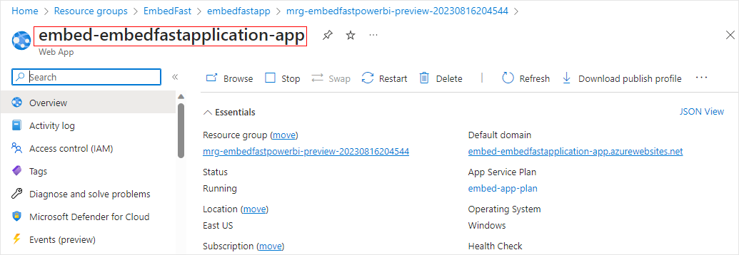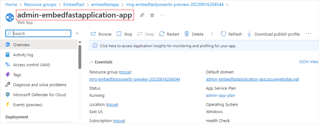 7. Alternatively, clicking the app's name takes you to its summary page where you can also see the admin web app name in a larger font.&#x20;