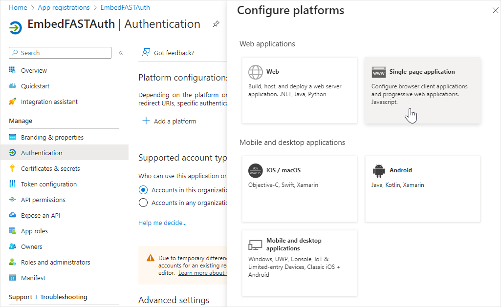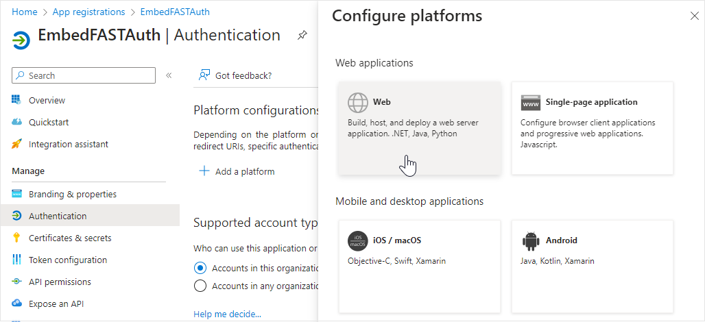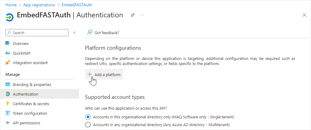 2. Click on **Owned applications** to see a list of applications you registered and click on **EmbedFASTAuth**. \[image with correct name needed]