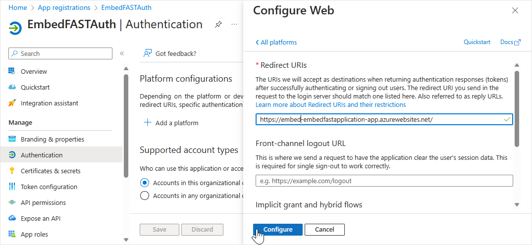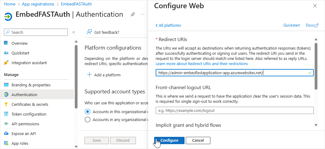 2. Enter the redirect URI for the admin web app in the **Redirect URIs** field. Click on **Configure** to save the changes.