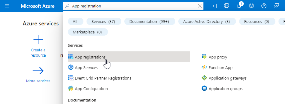 1. Type “**App registrations**" in the [Azure portal](https://portal.azure.com) search bar and select said option as it appears.&#x20;