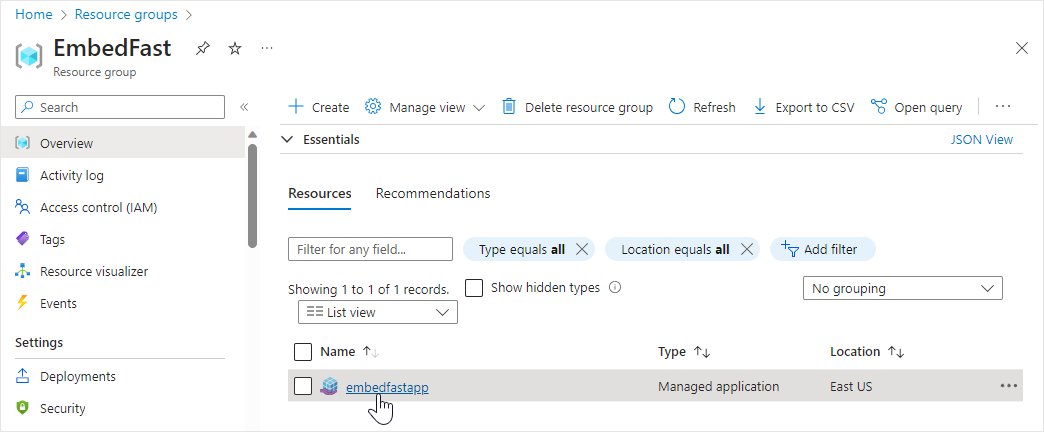 2. Once on the page, you will see a list of resource groups displayed. Select the resource group that you have used previously (to create the managed application).