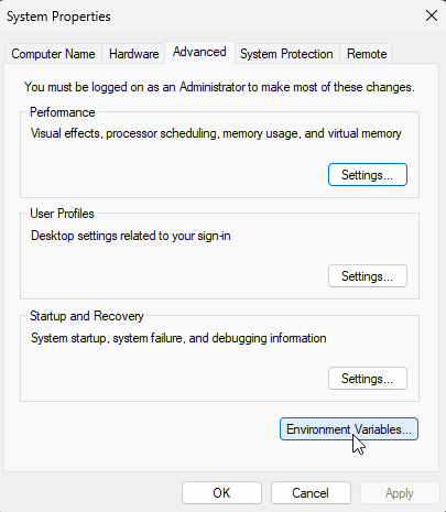 5. Click on **Environment Variables...** on the bottom-right of the **Advanced** tab.