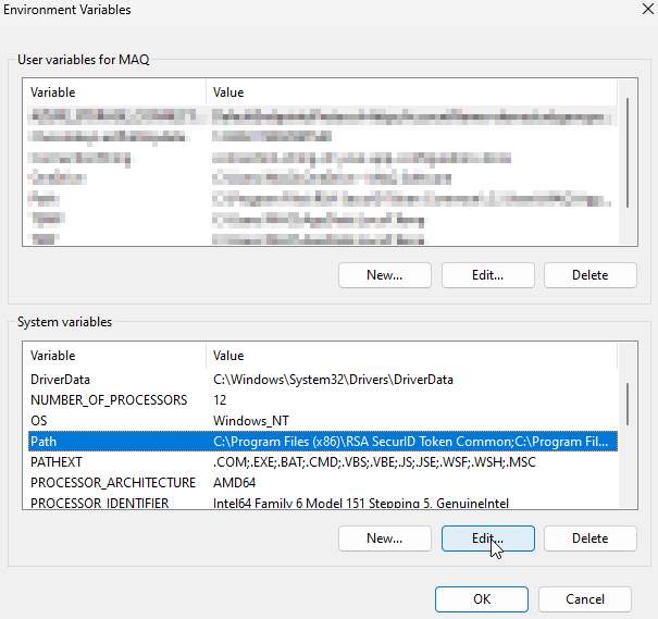 6. In the **System variables** section, select the **Path** variable and click on **Edit**.