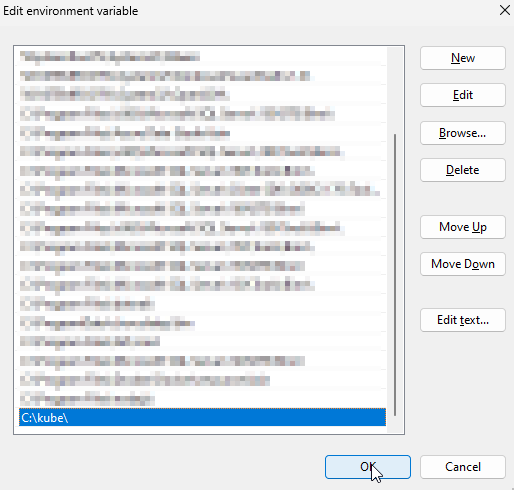 7. Click **New** and type "**C:\kube**" in the text field. Click on **OK** to add the text as a new path.