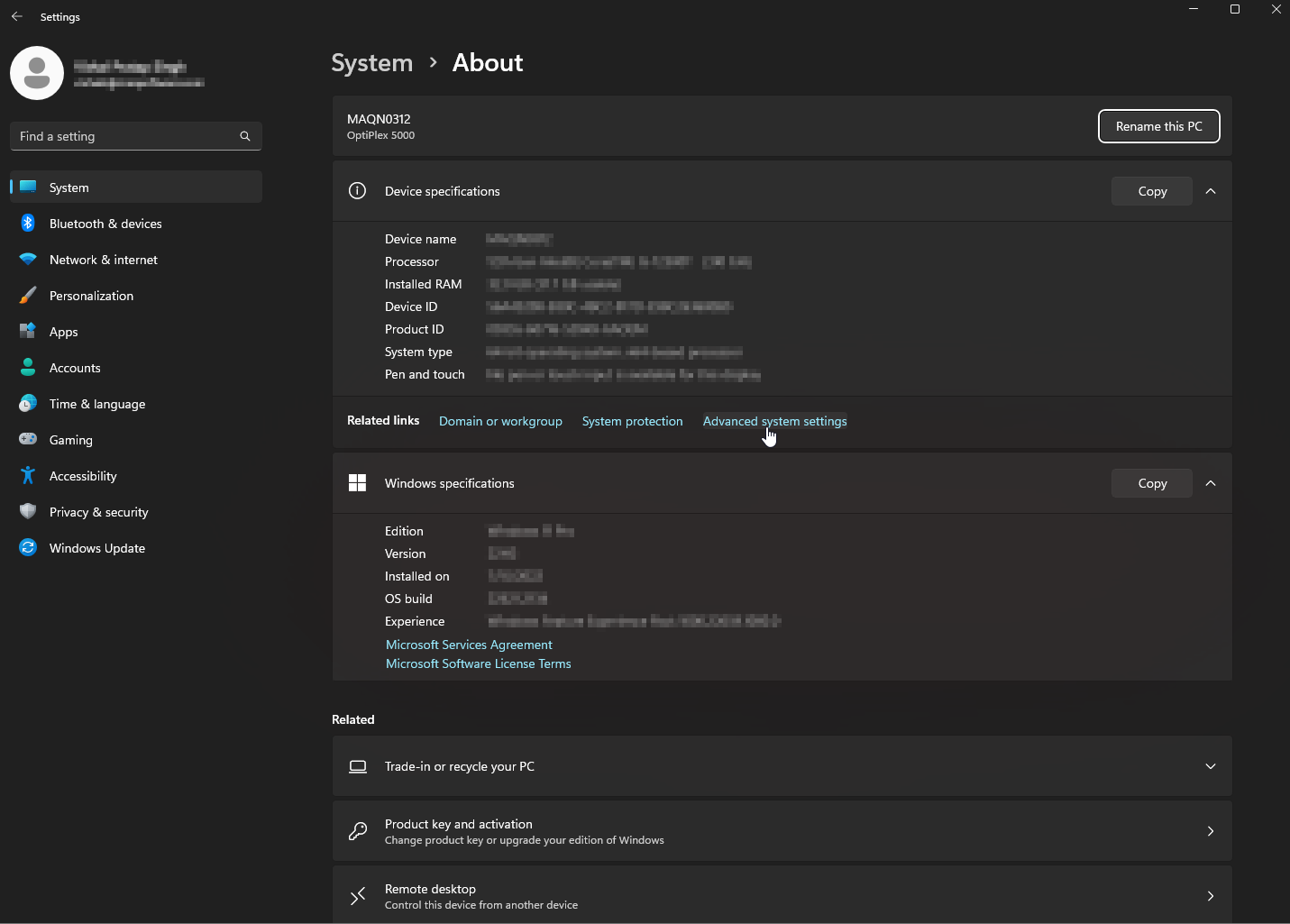 3. In the **About** window, click the **Advanced system settings** link below under the **Device specifications** section.